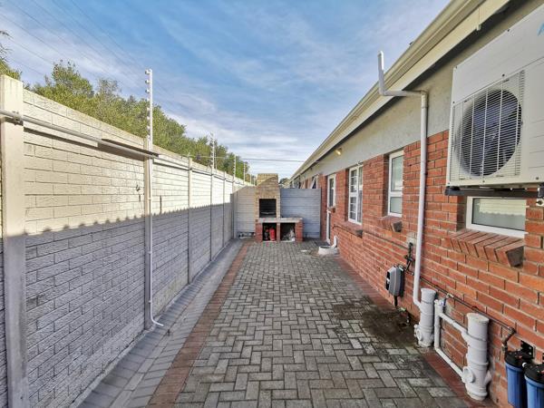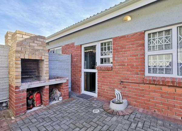 From the kitchen, a back door leads to an enclosed, paved courtyard complete with a built-in braai, making it an ideal spot for outdoor gatherings. The property is equipped with two 2500L ECO water tanks, fitted with filters and a pump, ensuring a reliable water supply.