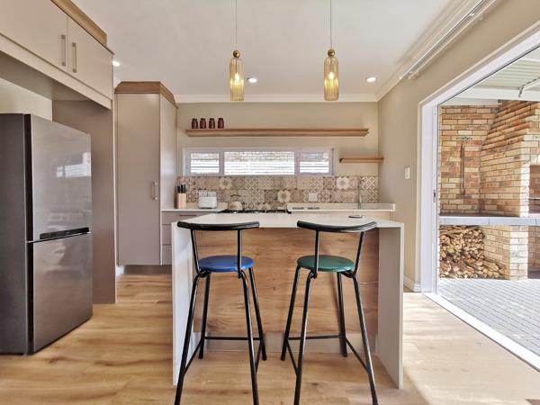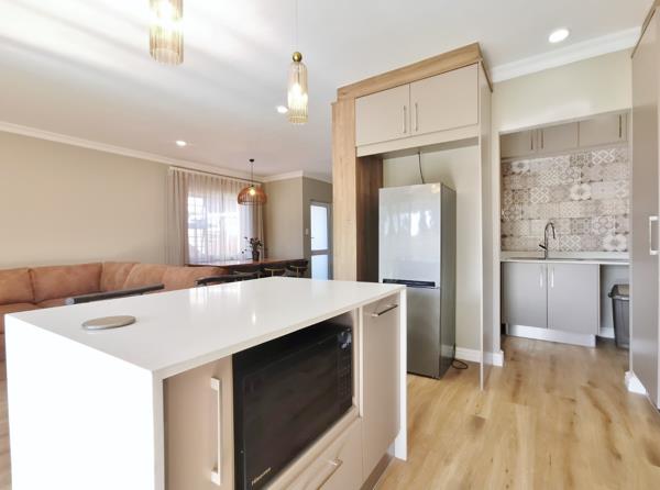 Downstairs, enjoy stylish open-plan living with a sleek kitchen fitted with a center island, scullery, and high-quality finishes. The spacious dining and lounge areas open to a tiled patio with a built-in braai, perfect for entertaining. A guest toilet is conveniently located downstairs, along with an inter-leading double garage for secure parking.