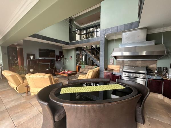 The kitchen is a beautifully designed space featuring gas top cooking and a separate scullery/Laundry. The open-plan layout connects the kitchen, dining room, lounge, and gas braai area, complete with an extractor, creating an inviting atmosphere perfect for entertaining or relaxing in the unique rock feature jacuzzi room that opens onto a balcony with breathtaking sea views.