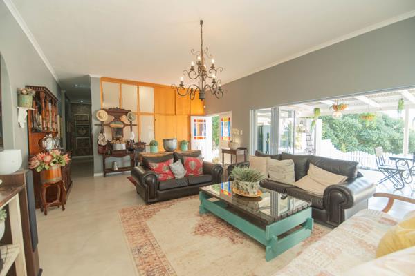 The living room is open plan to the indoor braai area with large stacker doors leading to a covered patio and is ideal for the family to relax and unwind. Leading onto a deck and sparkling pool.