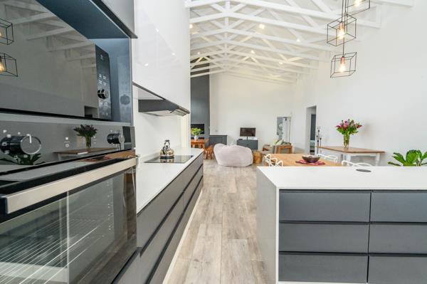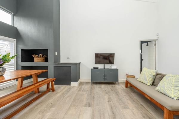 The living space is further enhanced by exposed rafter ceilings and a built-in braai, offering a welcoming setting for entertaining or everyday relaxation.