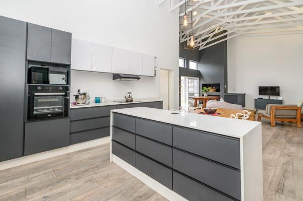 The interior layout is bright and contemporary, featuring vinyl flooring throughout and a seamless open-plan design. The kitchen forms the heart of the home, fitted with Caesarstone worktops, clean-lined cabinetry, and display cupboards that balance practicality with modern appeal.