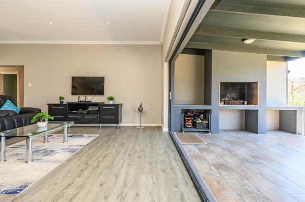 The home features a spacious lounge that flows to an undercover braai area, making it ideal for relaxed gatherings and indoor-outdoor living. A separate dining room connects to the well-appointed kitchen, complete with a scullery for added convenience and storage.