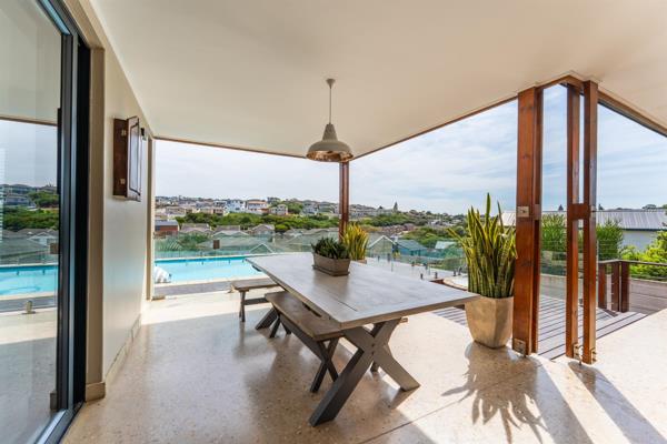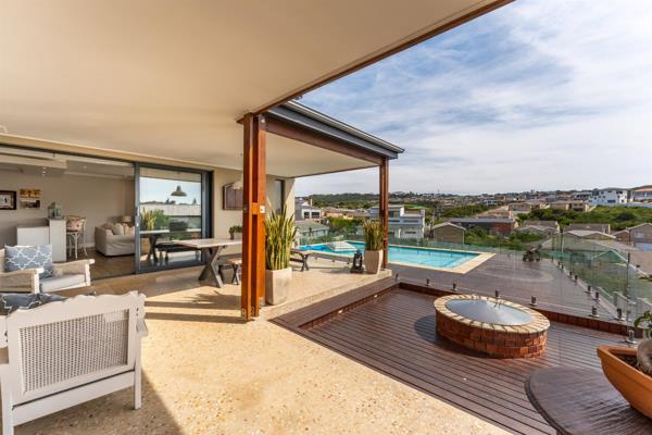 Entertainment spaces: A granite-topped bar and large undercover braai area, opening with stacker doors to a firepit, polished concrete floors, and a heated swimming pool with views.