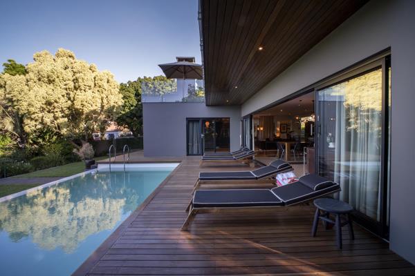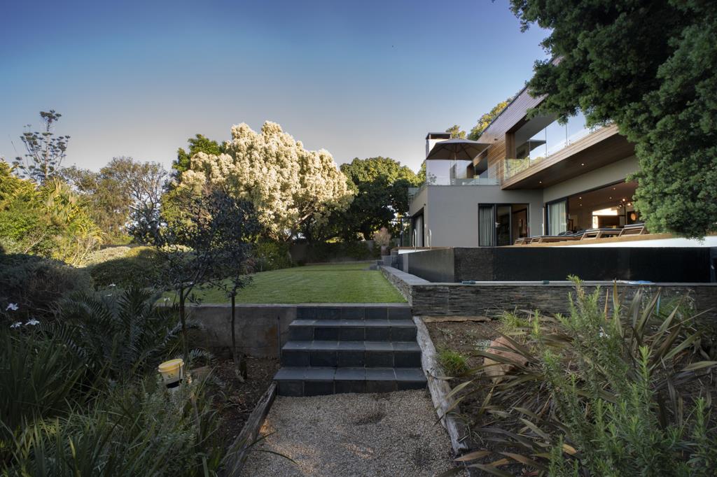 The home opens into a generous lounge, dining room, and TV area, enhanced by two fireplaces and underfloor heating that bring ambience and comfort. A well-sized guest loo and powder room is conveniently located nearby for visitors. Extending from the living spaces, a bar and braai pavilion extends the living space, flowing onto a rectangular salt-water pool framed in Balau decking. From here, landscaped gardens roll seamlessly into breathtaking valley views, with the historic Grey Clock Tower visible on the horizon. A sheltered firepit and pizza oven add the perfect setting for year-round entertaining.