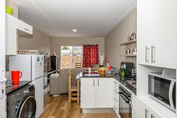 Welcome to your dream home! This modern apartment features a spacious living room that opens up to a sunny enclosed courtyard, ideal for relaxing or entertaining guests. The stylish open-plan kitchen is both functional and beautiful, equipped with an under-counter oven and electric hob for effortless cooking. Enjoy added security with solar geysers, wall-to-wall trellis gates, and bars, making it a perfect lock-up-and-go property.