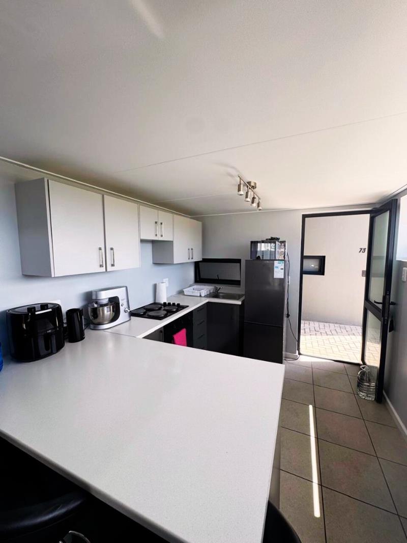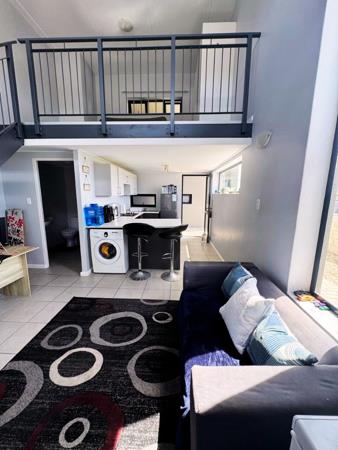 Discover modern living in this stylish 46 sqm loft apartment, perfectly situated within a secure complex in Newton Park, Port Elizabeth. This contemporary residence immediately impresses with its open-plan design, featuring high, vaulted ceilings and abundant natural light streaming through large windows. The sleek kitchen boasts modern two-tone cabinetry, light countertops, and a practical breakfast bar, seamlessly integrating with the living area. Tiled flooring throughout ensures easy maintenance and a cohesive aesthetic, while sliding doors offer convenient outdoor access.