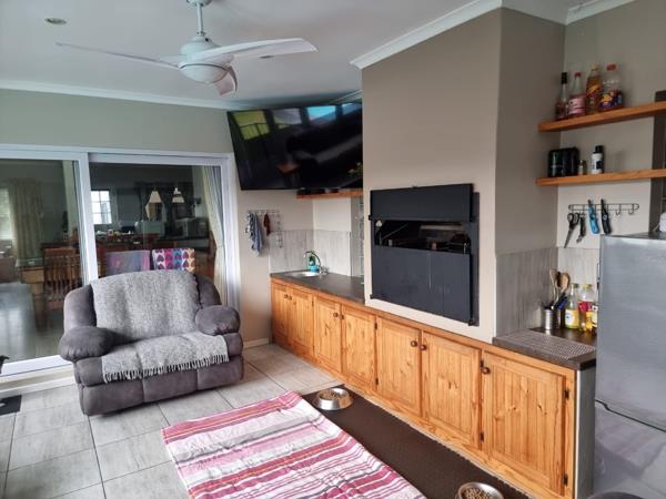 Set on a generous corner stand, the property includes 7 bedrooms, 3 bathrooms, and 2 fully fitted kitchens, split between two independent wings. At the centre is a large enclosed braai room with stack-away doors leading to a private pool and established garden ideal for year-round entertainment.