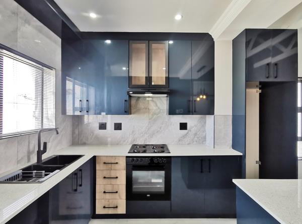 Designer Kitchen with oven and hob and extractor fan. Countertops and middle island are lovely Eazi Quarts. One point for dishwasher/washing machine. Stunning black basin and tap and hanging lights.