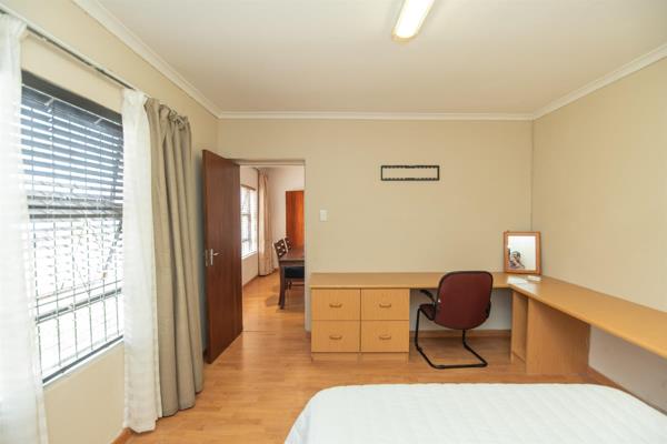 Bedroom 1 off the lounge is light, airy, spacious and minimalist style, features warm laminate flooring and soft neutral walls that create a calm, uncluttered atmosphere. A standout bonus is the extra-long built-in workspace perfect for remote work, studying, or a creative setup, adding real value for todays lifestyle needs. The layout easily accommodates a double bed with space to spare, allowing buyers to personalise the room to their taste. Whether used as a main bedroom, guest suite, or an ideal room for a student or young professional, this space offers both comfort and functionality.