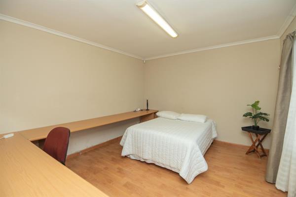 A standout feature! Perfect as a professional training space, home office, consulting room, studio, or a stylish entertainment area. Features multiple light-wood counter-tops and office chairs, suggesting a functional work environment. It includes amenities such as air conditioning, white board, ceiling lights, and trellis security bars on the doors and windows.