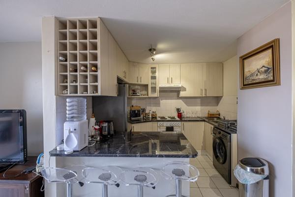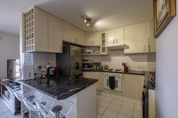 The heart of the home is the kitchen, which includes a built-in oven and stove, a washing machine attachment for convenience, and a bar counter with a built-in wine rack, which adds a touch of everyday luxury. Thoughtful security keeps everything serenely quiet: an alarm, trelligates at the front door and sliding door, and trelligates on every window, with an electric fence around the back of the complex.