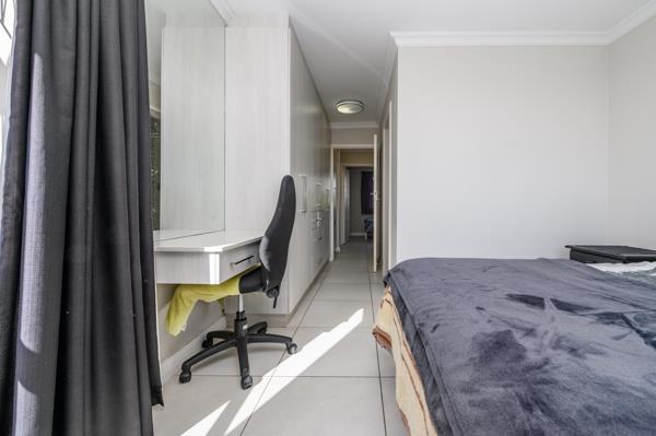 Both bedrooms are generously sized with built-in cupboards, and the main bedroom boasts an en-suite bathroom. This unit also includes two designated parking bays.