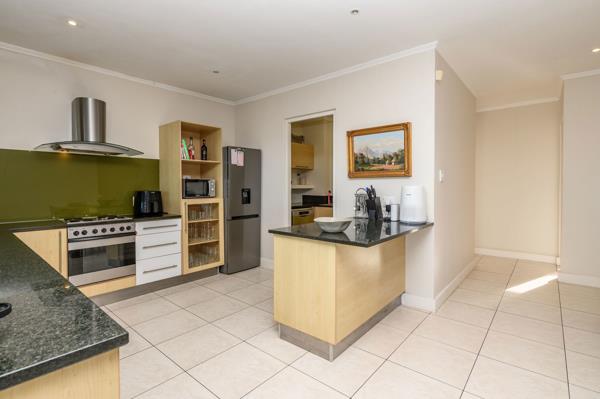 The stylish kitchen with it''s sizeable scullery merges effortlessly into the dining area, the design allowing the chef to socialise while serving sundowners and snacks or whipping up a meal. At the end of the day the three comfortable bedrooms encourage sleep against a soothing natural backdrop. The main bedroom has a sliding door to the balcony and a modern, full en suite bathroom. The family bathroom is simply gorgeous too, with a shower/bath combination , single vanity and toilet. The other two bedrooms are beautifully sunny and airy.