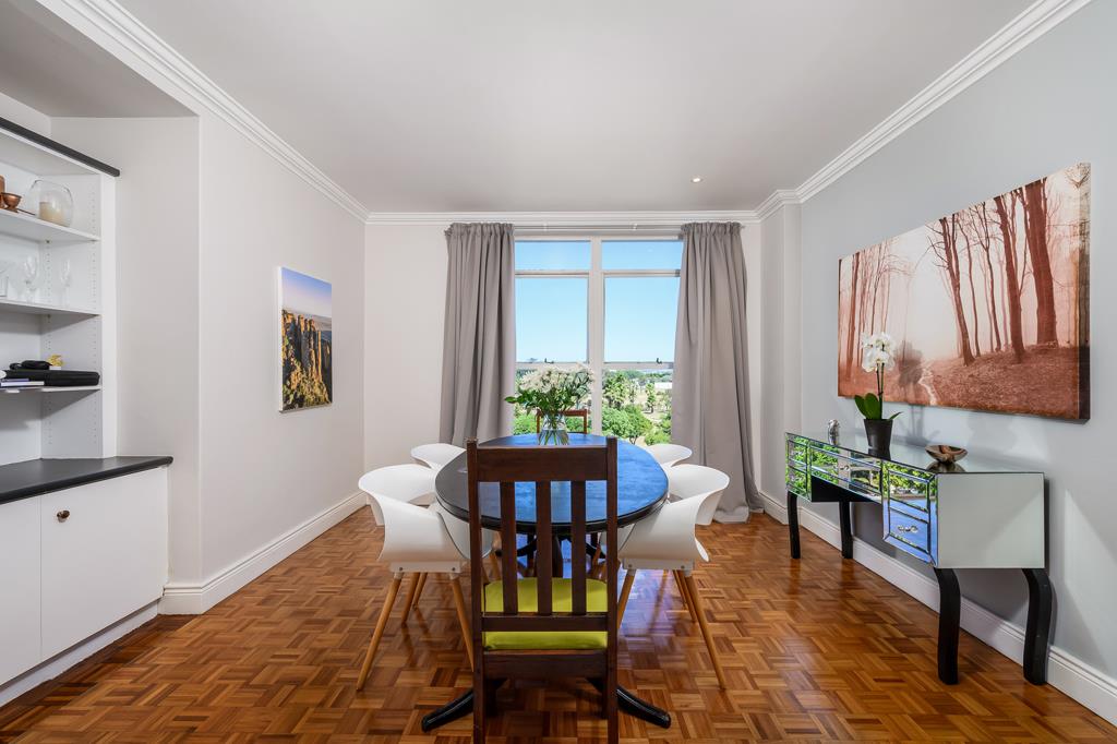 The kitchen is separate from the expansive living and dining areas, both of which enjoy stunning views of the park.