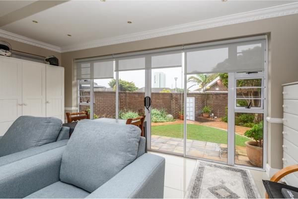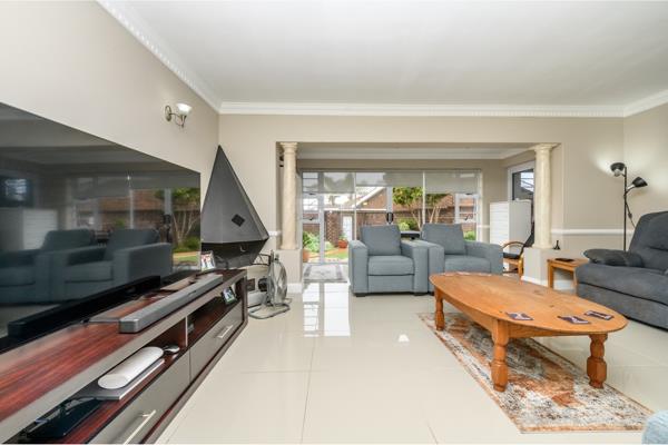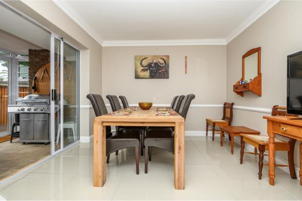 The lounge with fireplace offers is spacious yet cozy space during the winter months. The lounge, dining area and entertainment/braai room seamlessly transition via stacker doors to the outdoors, where a beautifully manicured garden awaits.