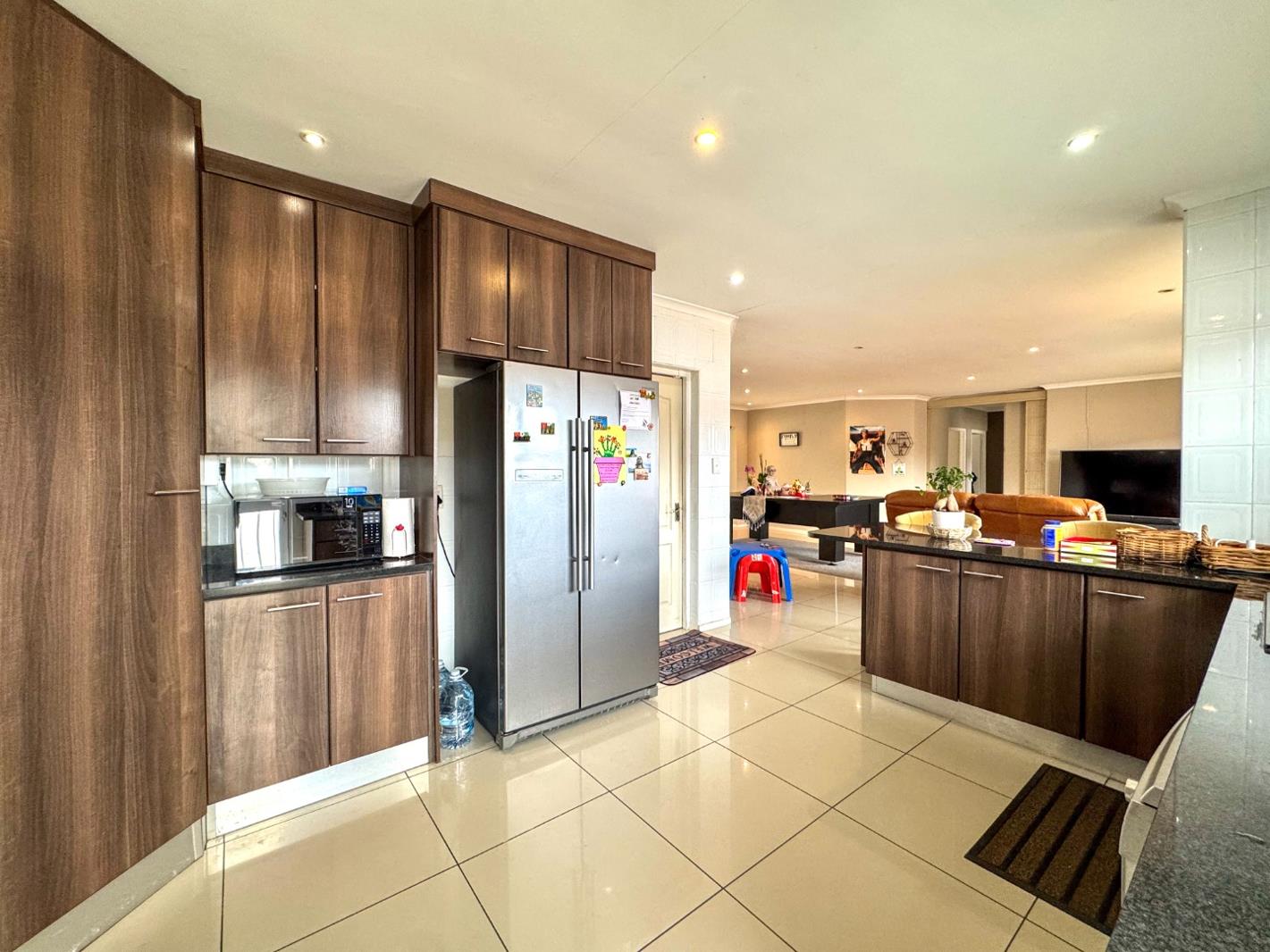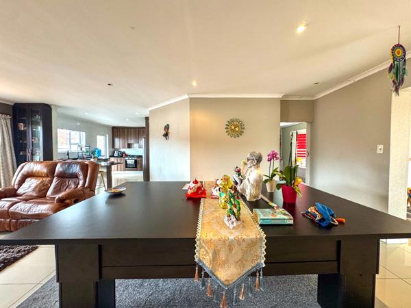 The kitchen flows seamlessly into the spacious lounge, dining area, and reception room with built in door braai area that leads out to the patio, all beautifully tiled with sleek porcelain tiles.