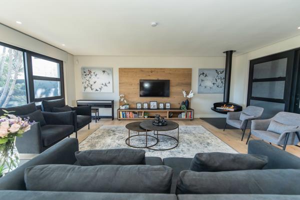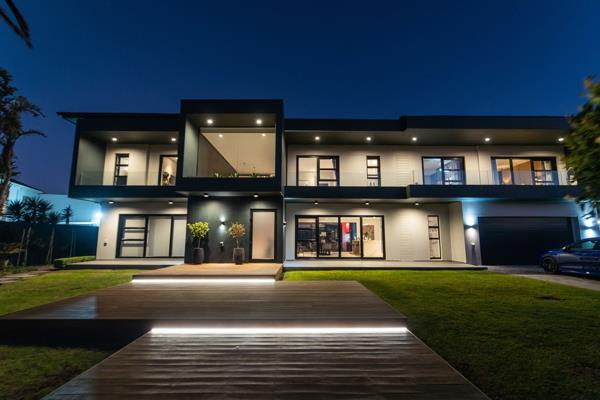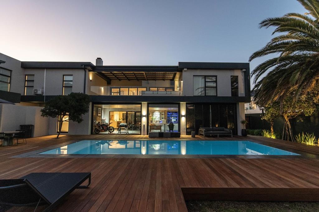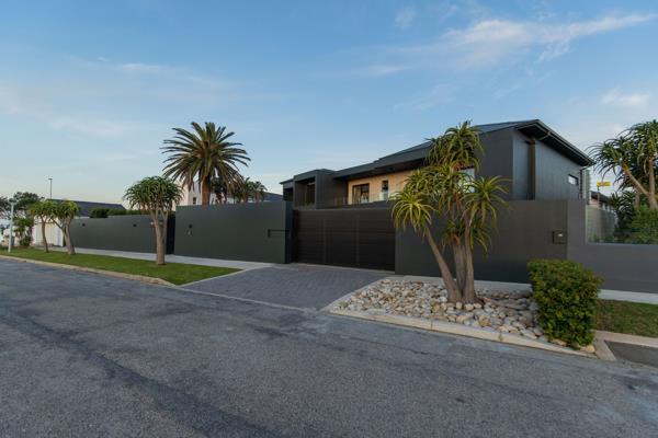This modern mansion at the beach has 6 luxury-sized bedrooms and 7.5 gorgeous bathrooms. All bedrooms are en-suite. The master suite has a private lounge with a balcony and his and her dressing rooms, showers, and bathtub. In addition, there is a warm inviting entrance hall with a private lounge, glowing fireplace, cinema room and large open entertainment room with a gleaming stainless steel built-in braai that opens onto a captivating swimming pool, garden, and additional tastefully decorated outbuildings. The dining room and kitchen come alive with engineered countertops, gas, and electric ovens, ample high gloss cabinetry and stacker doors that lead to a well-manicured front garden. Living areas are all interlinked to create a sense of convenience and lavish open living. Light oak and granite flooring are found throughout. No expense has been spared to create this exclusive property.