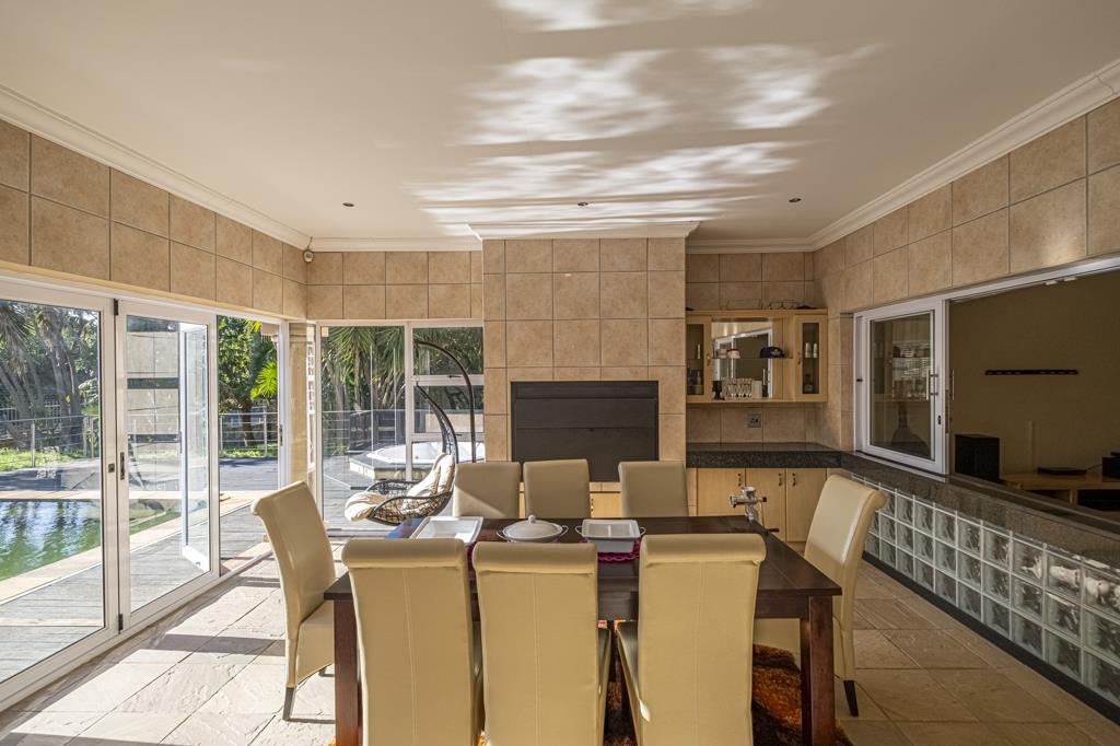 Stunning Kitchen and Living Areas: The gourmet kitchen is equipped with ample cabinet space and a separate scullery, catering to all your culinary needs. The living area is designed for entertainment and comfort, featuring stacker doors that open up to the exquisite gardens adorned with a spacious deck. The home''s outdoor spaces are ideal for hosting gatherings, complete with a second built-in braai area surrounded by white aluminum shutters to provide shade on sunny days.