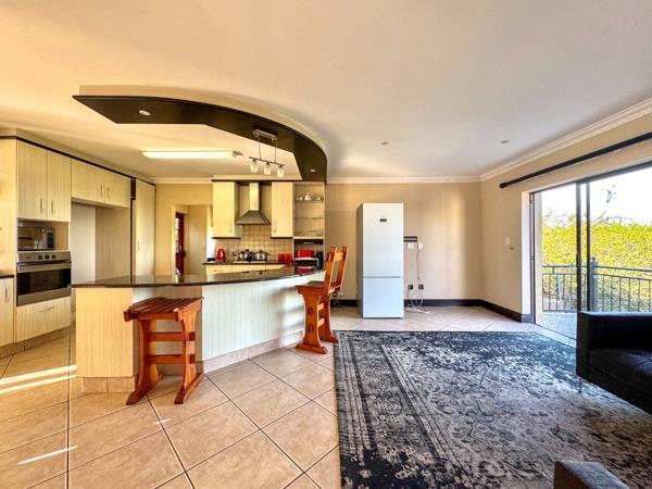 Step outside to a private garden with an outdoor swimming pool, perfect for relaxation and entertaining. A covered patio area and a built-in braai further enhance the outdoor lifestyle. Enjoy breathtaking panoramic views of the lush green landscape stretching towards the distant ocean horizon from your balcony. Practical features include a double garage, two additional parking spaces, and paving.