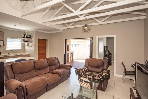 This light-filled family home offers spacious open-plan living areas that flow seamlessly into a stylish modern kitchen, complete with an under-counter oven and ceramic hob. The lounge opens through elegant stack doors onto an inviting undercover patio with a built-in braai ideal for effortless indoor-outdoor entertaining.