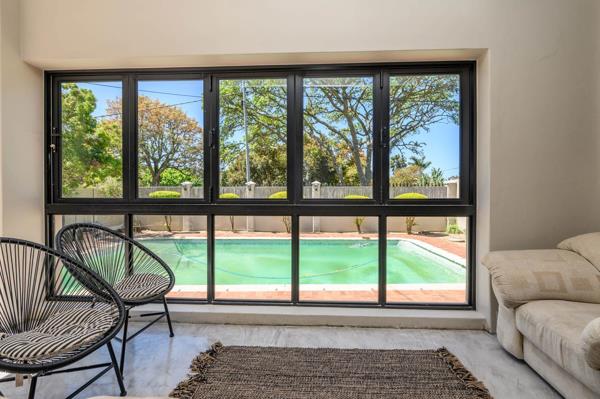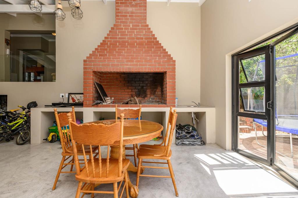 The main living room and entertainment area is the heart of the home and boasts two fireplacesone being a braai masters dream, built in charming red face brick. Aluminium stacker doors provide seamless access to the paved pool area, while big aluminium windows overlook the sparkling pool, enhancing the indoor-outdoor flow of the home