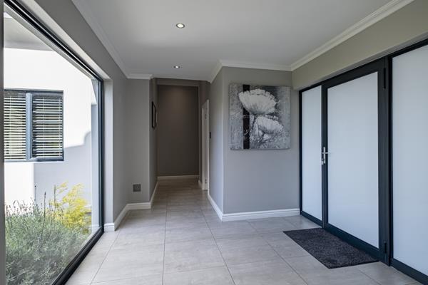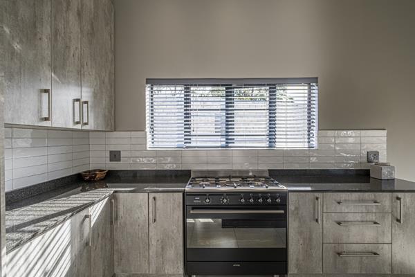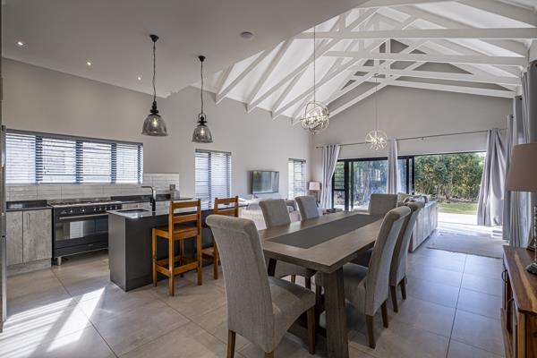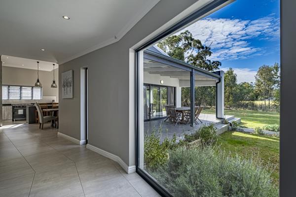 Flowing from the living space, the covered patio with a built-in braai offers seamless indoor-outdoor living with uninterrupted garden and greenbelt views.