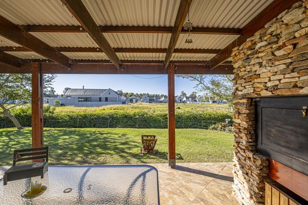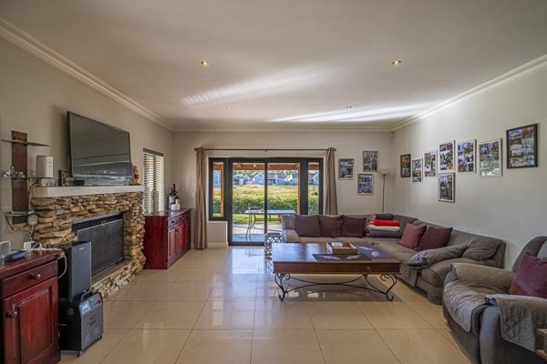 Step inside to an expansive open-plan living area, where the lounge and dining room are warmed by a wood-burning fireplace adorned with exquisite stone cladding. Large aluminum doors open effortlessly to a wraparound entertainment patio, complete with a built-in braai, timber detailing, and tranquil garden viewsideal for hosting guests or simply enjoying the serene surroundings.