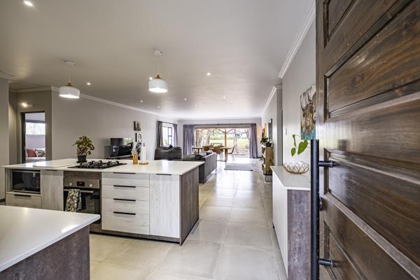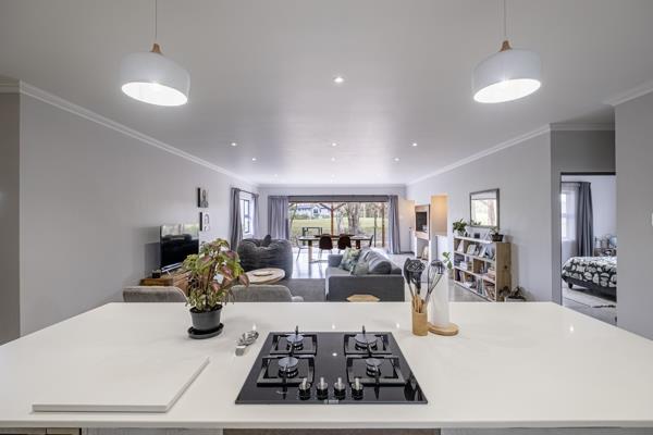 Step through the front door, strategically placed to shield you from prevailing winds, and be greeted by an expansive living area. This open-plan space seamlessly integrates a well-appointed kitchen, complete with a large island and separate scullery, into the living areas. The design ensures a harmonious flow throughout the home, making it ideal for both everyday living and entertaining.