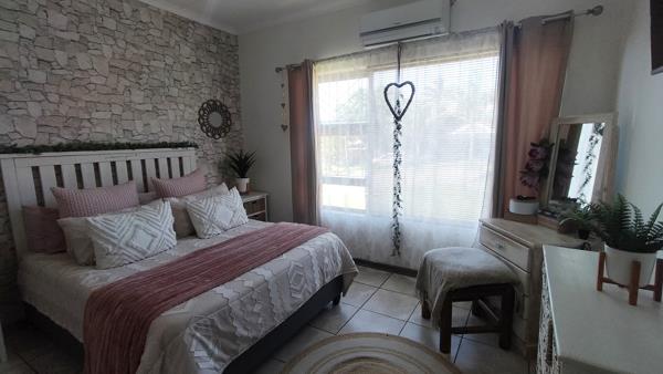 The family bathroom is tastefully modern, fitted with a bath, basin, and toilet. The main bedroom offers built-in cupboards, air conditioning, and an en-suite bathroom with a shower, basin, and toilet. The second bedroom features wall-to-wall built-in cupboards, while the third bedroom also has built-in cupboards and a ceiling fan.