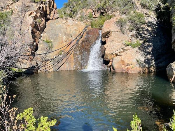 The landscape invites exploration, with hiking trails that lead to a hidden waterfall where you can swim in crystal-clear waters. Wildlife such as Eland and Kudu roam the veld, creating a private game-viewing experience right at your doorstep. Off-grid living is made effortless with solar power, a wind turbine, borehole water, gas appliances and a splash pool to cool down on warm afternoons.