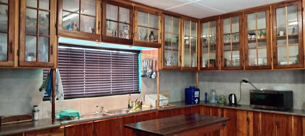 The open plan, farm size kitchen is defenatly the heart of the home and will make meal preperation and dinner time with family or friends a very memorable event. The kitchen is equiped with lots of cupboards, finished in beautiful ever lasting black wood.