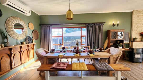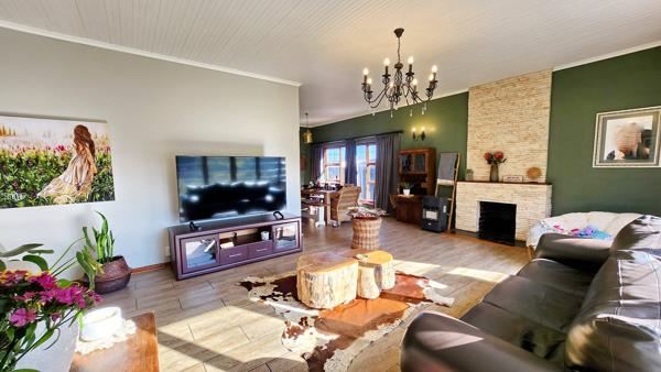 Spacious open plan lounge with fireplace and dining room with aircon.