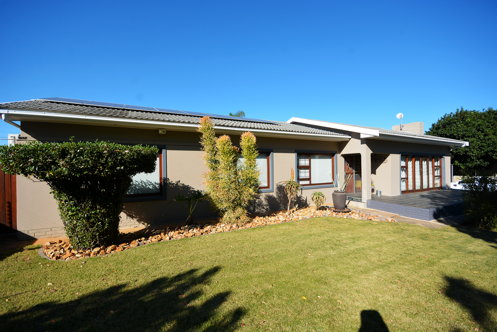 8 CCTV cameras, beams around the house, 8 solar panels with 5kw inverter system, which includes 2 batteries, 3 x aircons, jacuzzi, 4 x water tanks connected to a water filter system, 2 x additional water tanks to top up the swimming pool and for garden use. Aluminium windows for low maintenance and a secure, spacious backyard at the pool area.