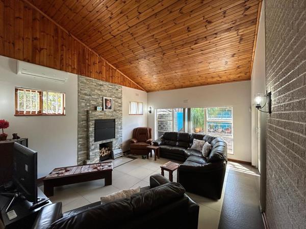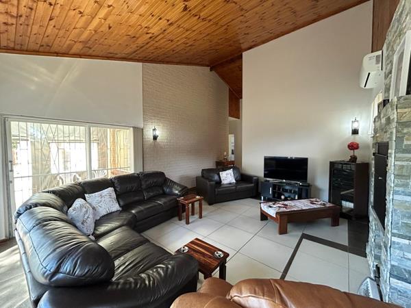 The spacious lounge or TV room features a built-in braai and an undercover patio with roller blinds, overlooking the inviting pool area with a relaxing morning coffee.