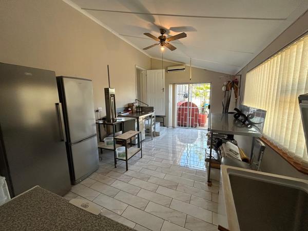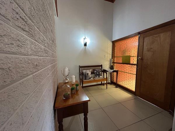 Safety is a priority with a security gate in the passage and in front of the main bedroom. The ensuite main bedroom is a true retreat, featuring built-in cupboards, air conditioning, laminated flooring, and a sunroom that opens directly to the pool area.