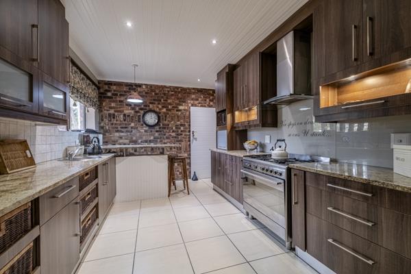 The modern kitchen is a chefs delight, finished with elegant dark mahogany cupboards, granite countertops, a gas stove with extractor fan, and a separate scullery with laundry facilities. A dedicated study leads off from the dining area, providing a quiet space for work or reading.