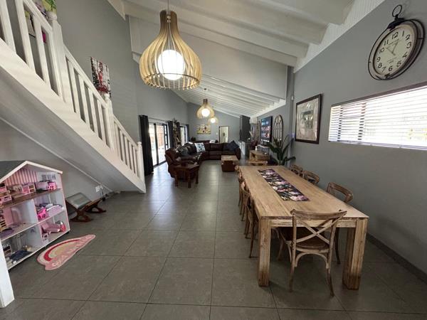 This stunning property features an inviting entrance hall that seamlessly leads into the Garage and Kitchen. Open plan living space, combining a modern kitchen, dining room, TV room, and a braai area perfect for entertaining guests. A convenient guest toilet is also included in this area.