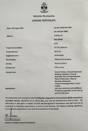 This large, gentle sloping plot with direct access onto the main tarred road of Bathurst, is located within walking distance to the famous Pig andamp Whistle Hotel, pub and shops. The plot is zoned for Business 2 rights, which is a huge opportunity for a developer that wishes to invest in this region.