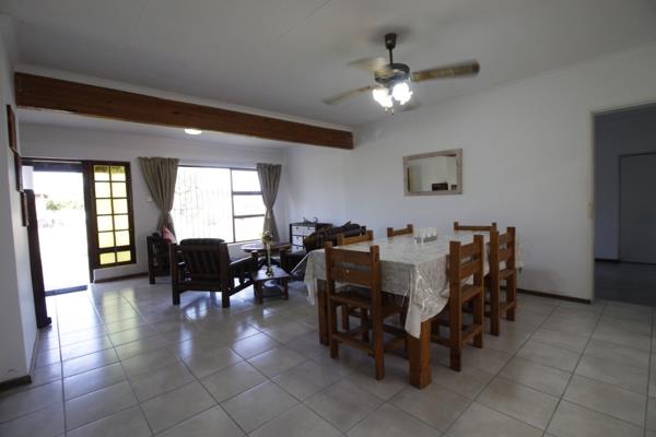 An open-plan lounge, dining, and kitchen area flows to outdoor living, where a built-in braai and a spacious garden surrounded by trees create the perfect setting for weekend relaxation and entertaining