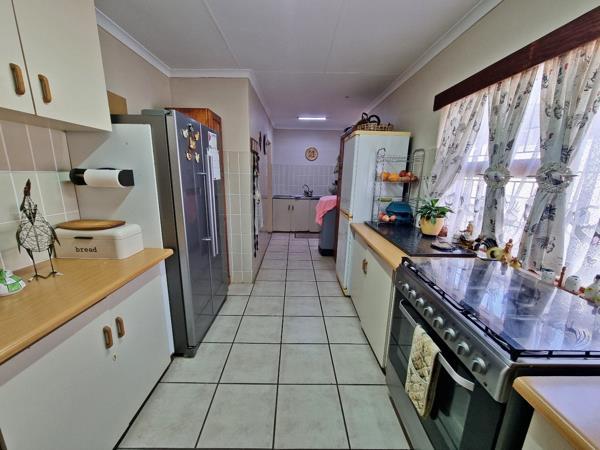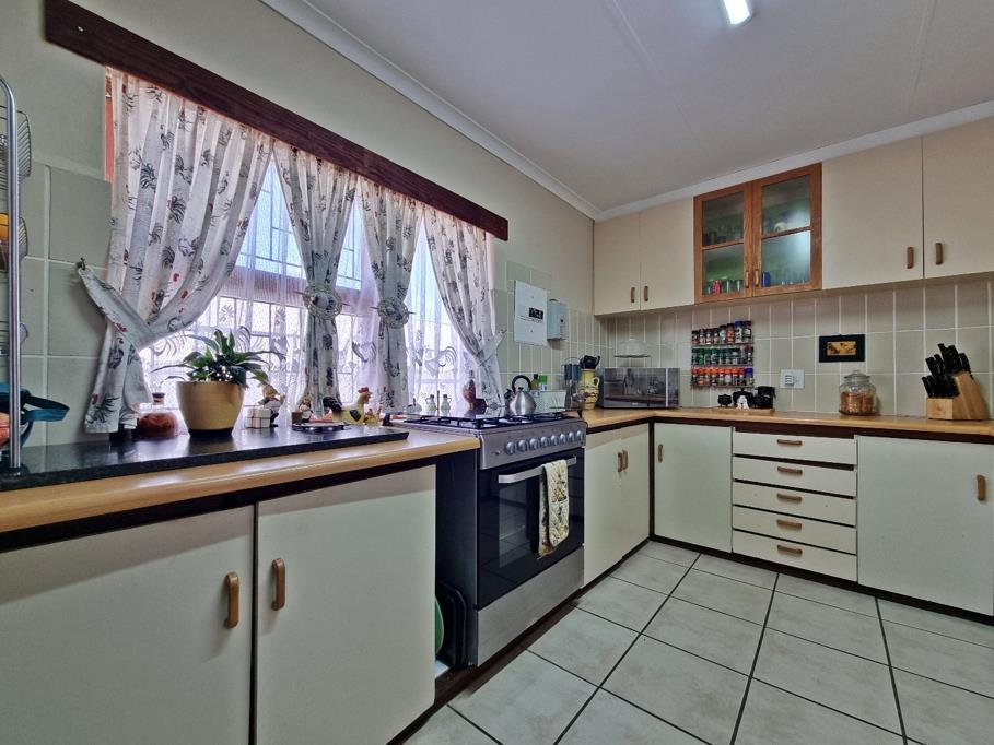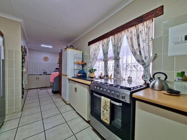 DUAL MANDATE: This comfortable family home is situated in a quiet street and offers the perfect balance of functionality, and entertainment space. A covered porch leads into a spacious lounge and dining area, finished with tiled floors, curtains and secure burglar proofing. On the other side of the lounge, you will find the spacious kitchen equipped with a double sink, ample counter space, a six-burner gas stove with electric oven, pantry cupboard, and a washing machine connection. The kitchen door gives you direct access to the back garden.