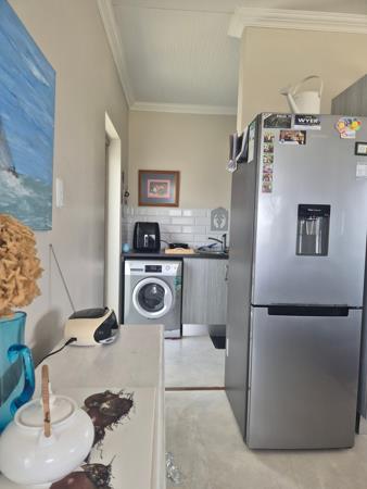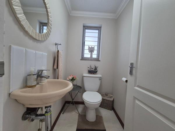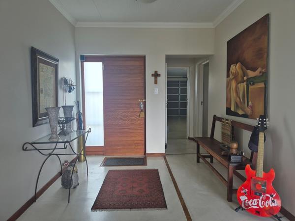 The house has a lovely open floor plan with kitchen, dining and lounge area. The kitchen is thoughtfully designed and is fitted with a gas hob and double eye level oven. Stylish cemcrete flooring throughout the property. Separate scullery with plumbing for dishwasher and washing machine and a generous pantry cupboard.