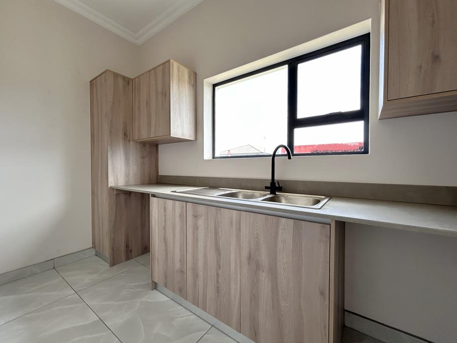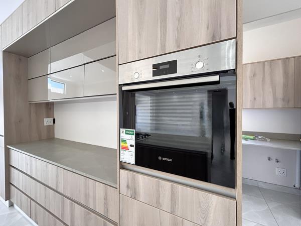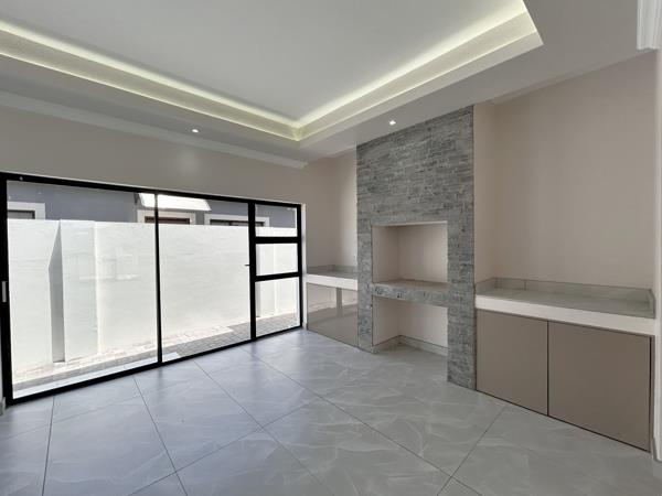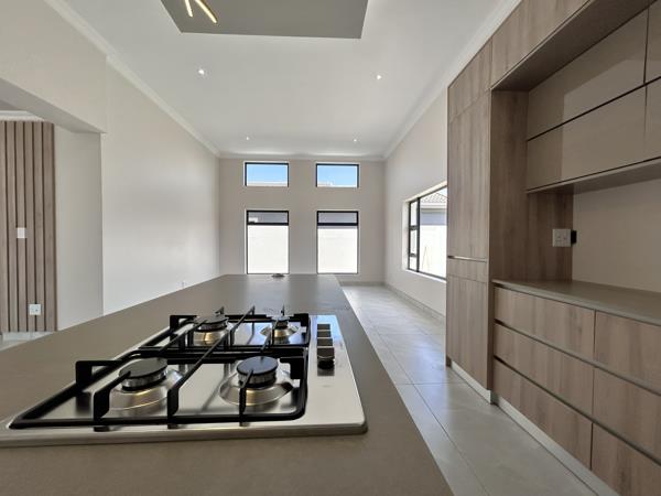 The kitchen is a standout feature, fitted with quality finishes, a large island and a dedicated scullery. It opens toward the dining and lounge area, creating a practical flow for everyday use. The entertainment room includes a built-in braai and full stack doors leading outside, adding flexibility for gatherings in any season.