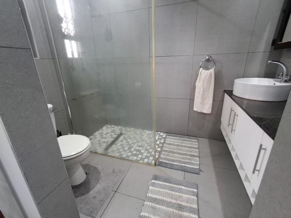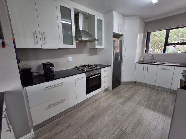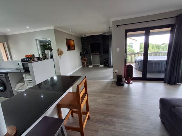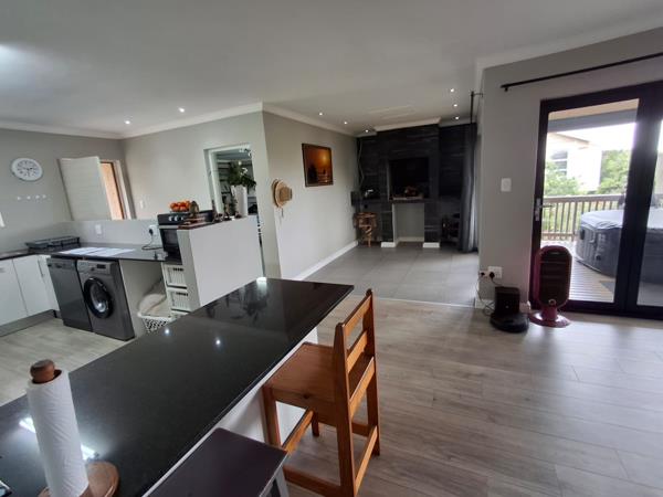 The living area extends through stacker doors onto a stunning wooden deck, providing a private escape overlooking a lush kloof. Here, you can enjoy the sounds of nature while relaxing in the sheltered Jacuzzi. The braai area, also located on the deck, makes it easy to host gatherings with friends and family. Surrounded by dense bush and trees, this home feels like a true sanctuary, with regular visits from local wildlife.
