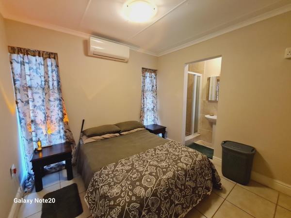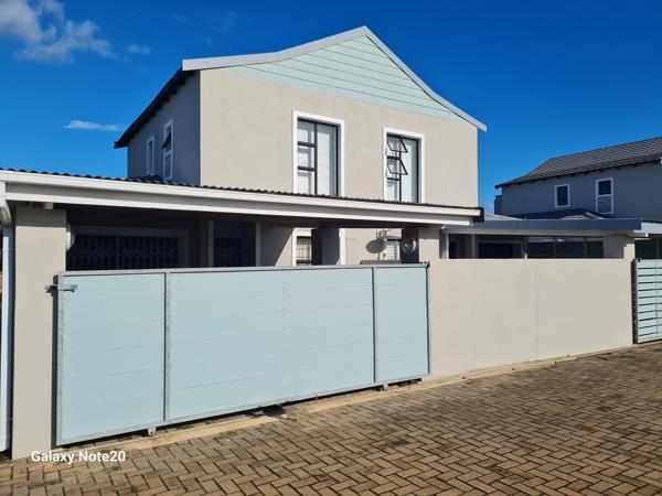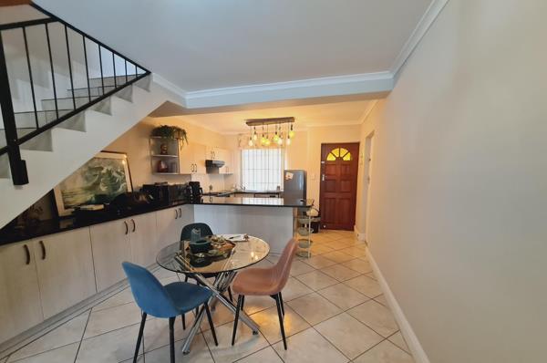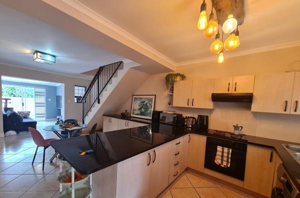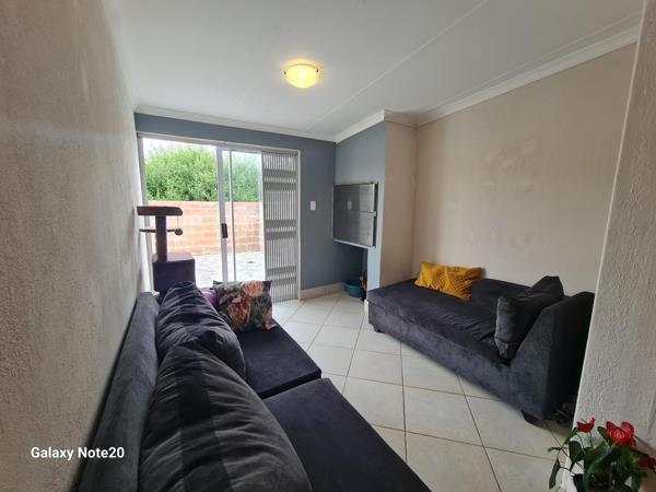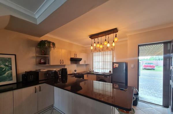 The home features a modern open-plan kitchen, dining area, and an indoor braai, perfect for entertaining. A sliding door leads to a private backyard, offering a peaceful space to relax and unwind.