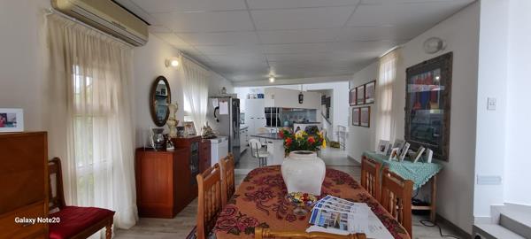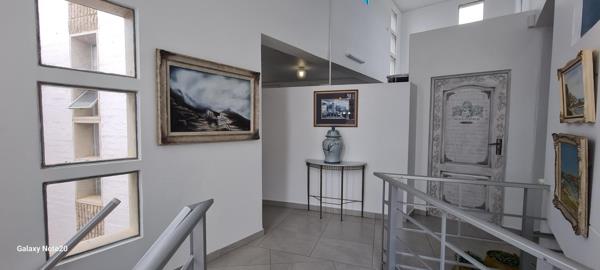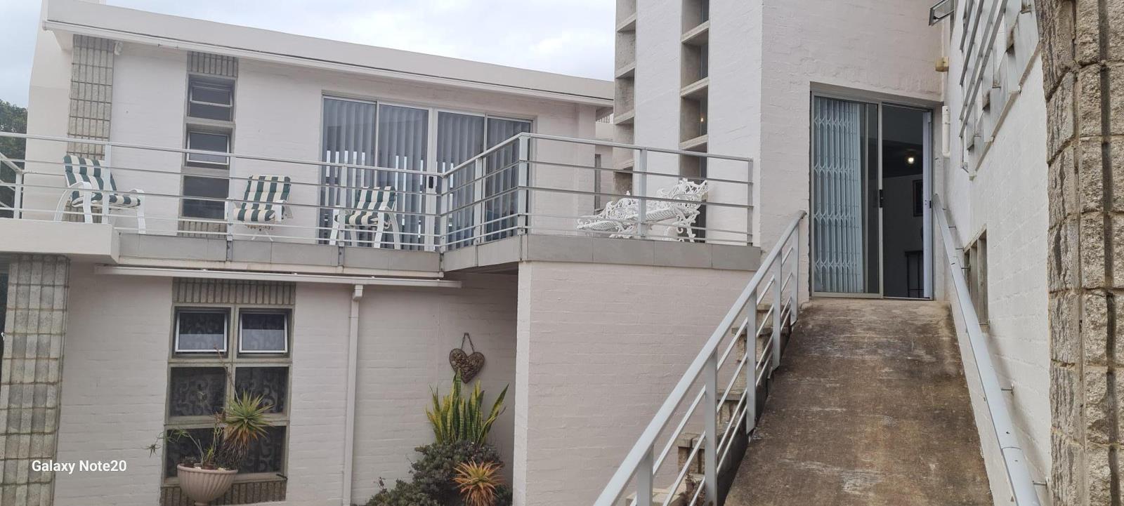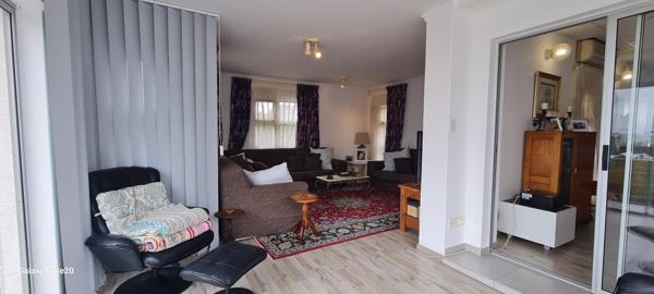 A welcoming entrance leads into an open-plan kitchen and dining area. The formal lounge opens onto a balcony that has been enclosed as a sunroom, offering beautiful sea views. There is also a spacious braai room with access to a balcony on one side and to the main bedroom on the other. While the passage to the main bedroom is slightly steep, it remains wheelchair friendly.