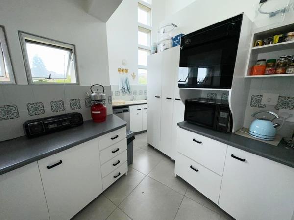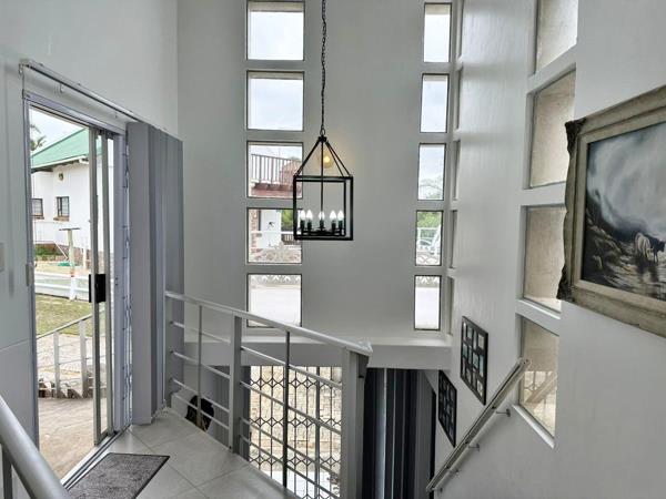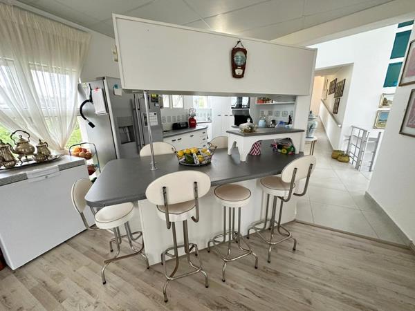 On the top floor the kitchen is open plan to a dining room which extent into a lounge and TV room. The lounge opens onto a lovely sun deck which overlooks a treed garden and the ocean. This area is protected from the West wind. Opposite the kitchen, slightly elevated is a separate wing housing an indoor braai with built in gas braai. The main bedroom is also slightly elevated and completely private. it is provided with a walk in cupboard and a classic en-suite bathroom full.