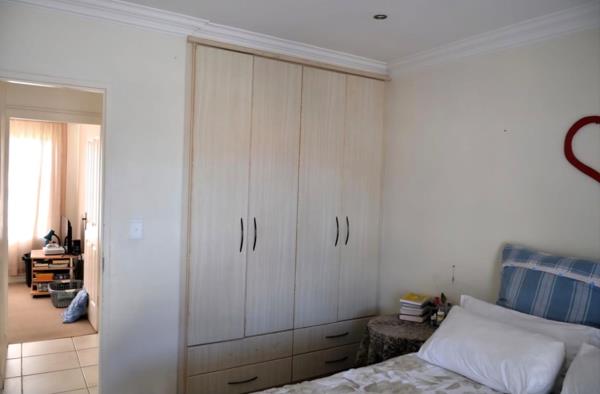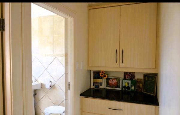 The ground floor features an open-plan kitchen with a breakfast nook, and a lounge area that leads out to a covered stoep with a built-in braai, perfect for entertaining. One bedroom with an en-suite bathroom and a guest toilet are also located on this level. The back door opens to an enclosed courtyard, adding to the privacy and comfort of the unit.