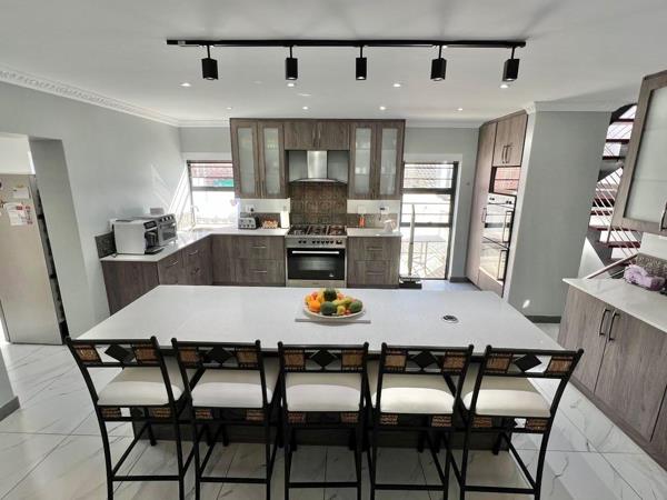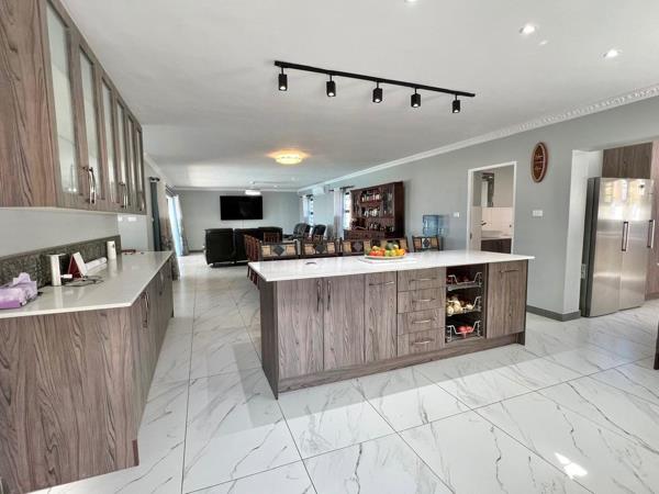 The modern kitchen features ample cupboard space and a separate scullery, ensuring effortless meal preparation. The open-plan living area seamlessly connects to the braai area and pool, thanks to expansive stacking doorsacreating a perfect indoor-outdoor entertainment experience.