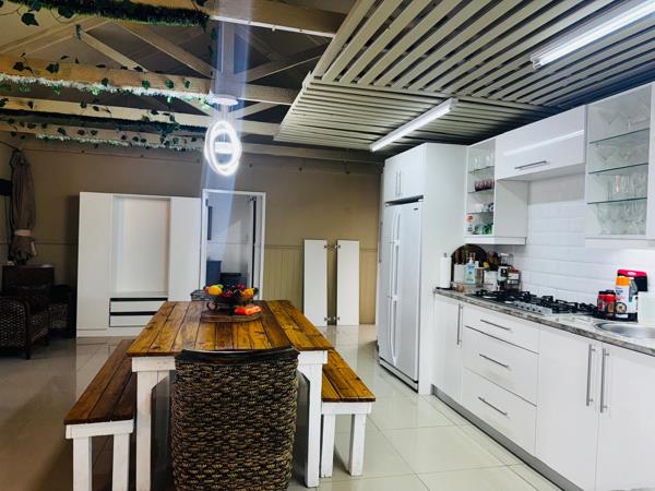 The open-plan kitchen boasts an abundance of built-in cupboards in a soft snow-white finish, creating a warm and inviting space. It flows seamlessly into the dining and lounge area, where youll find an indoor built-in braai ideal for gatherings with family and friends. Step out onto the open stoep to enjoy sea views and the refreshing coastal breeze.